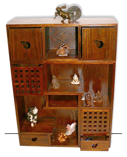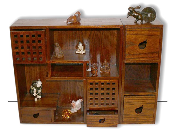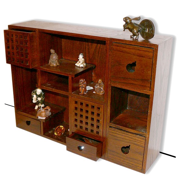 Деревянная полка с выдвижными ящиками для коллекций нэцкэ и окимоно.