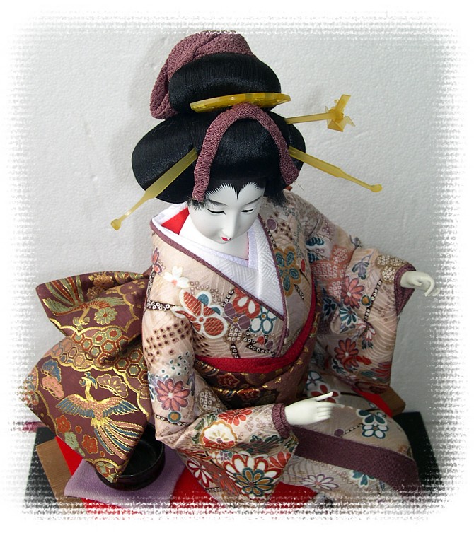 интерьерная японская кукла в стеклянной витрине-коробке, 1980-е гг.