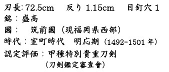 - Омотэ-мей 表銘: Moritaka 筑前國.(Kirijiri nakago shape)