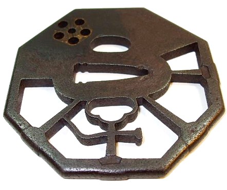 Тема: Сложная самурайская символика: конструкция в виде восьмиугольника, герб Умебачи (цветок сливы умэ - 5 кругов вокруг одного меньшего), облако и согнутый гвоздь. Умебачи или как еще его называют hoshi-umebachi является символом храма Китано Тенмангу в Киото. Считается Умебачи стал символом храма во времена Сугувара-но-Мичизанэ - выдающегося ученого и государственного деятеля эпохи Хэйан Буквальное значение hoshi-umebachi-mon - знак звезды Цветушей Сливы. Какая звезда имелась в виду является загадкой.