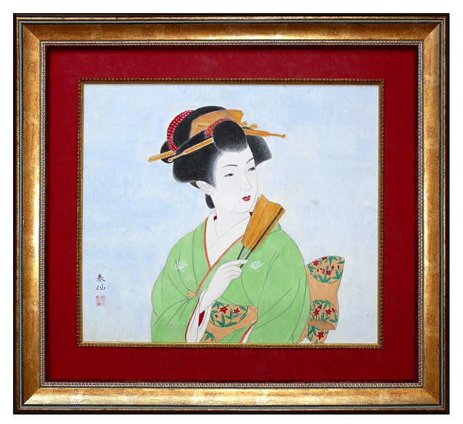 Портрет молодой дамы с веером в руке, картина в раме, Натори Шунсэн (1886-1960)